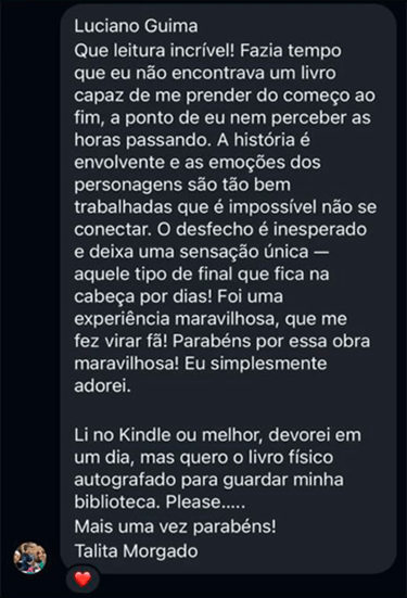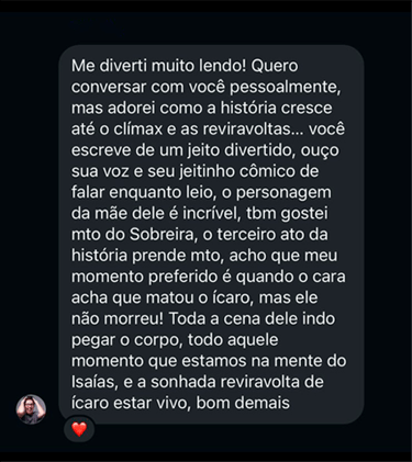 Em sua primeira ficção, o autor LUCIANO GUIMA convida os leitores a acompanhar Ícaro em uma narrativa repleta de tensão e descobertas. Entre o real e o imaginário, a história revela como os laços de sangue e as redes sociais podem usurpar sua vida. Ao final, os acompanhantes dessa saga vão ter curtido a experiência, mas Ícaro, se pudesse voltar no tempo, bloquearia aquele perfil, sem hesitar.